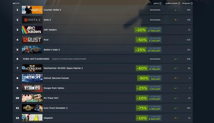Если же говорить про лидеров, то первое место уже никого не удивляет — Counter-Strike 2 остаётся королём Steam благодаря продажам кейсов, пропусков и прочих внутриигровых предметов. Следом идут ARC Raiders и Steam Deck, которые не растеряли своих позиций в сравнении с прошлой неделей. А вот четвёртое место досталось Battlefield 6, которая как раз поднялась на четыре строчки выше.