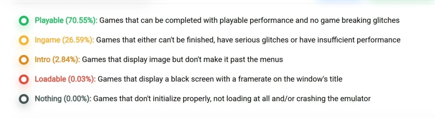 По состоянию на вторую половину января 2026 года 70,94 процента игр для PS3 имеют статус playable, то есть их можно пройти до конца без серьёзных проблем с производительностью и критических багов.