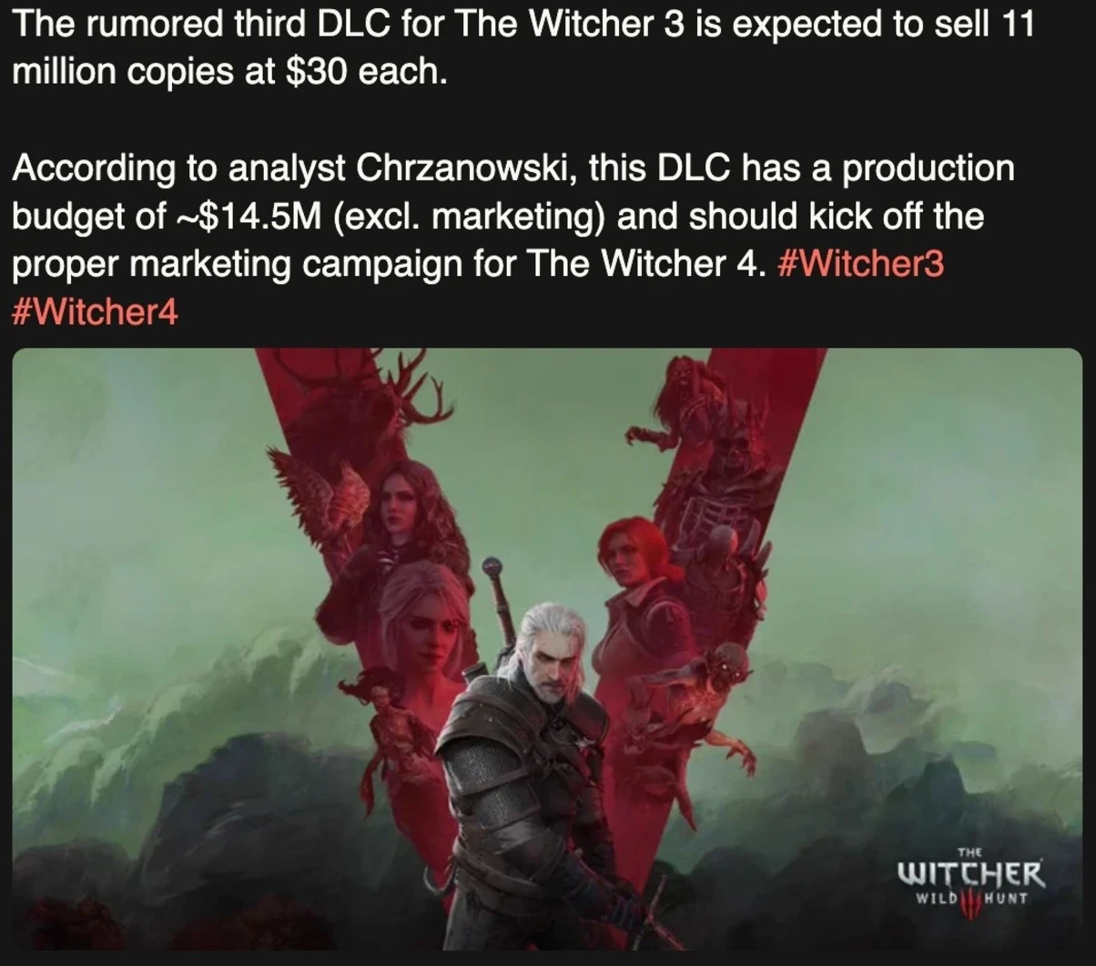 Неофициальные источники также утверждают, что дополнение станет мостом к «Ведьмаку 4», где главной героиней будет Цири. Разработкой может заниматься Foolʼs Theory — партнёрская студия CDPR, в которой над неанонсированным проектом работает более сотни сотрудников.