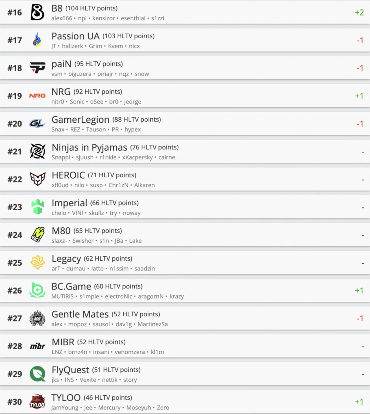 • Astralisприбавила сразу два пункта, закрепившись в топ-12.