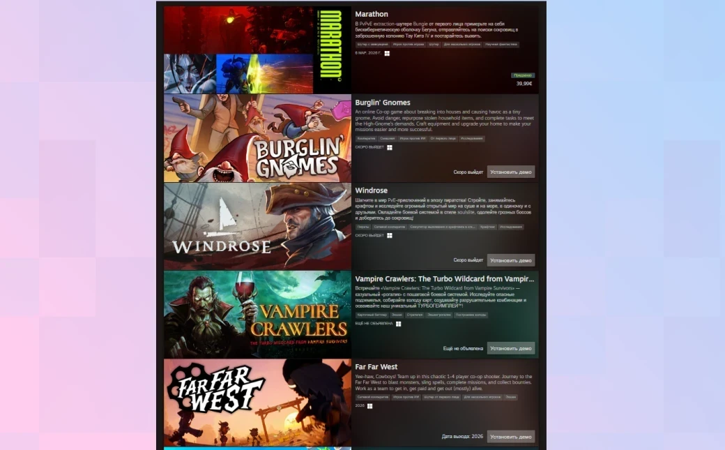 Первое место досталось Marathon — новый шутер авторов Destiny был доступен всем желающим в рамках стресс-теста. Второе место заняла Burglin’ Gnomes — это кооперативная игра о маленьких гномах, которые врываются в дома и сеют хаос. А закрывает топ-3 пиратская выживлка Windrose.
