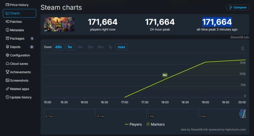 Кстати, пиковый онлайн у игры весьма приличный — 171,664 одновременных пользователя. Причём рекорд обновился всего 3 минуты назад. Вероятно, показатель ещё успеет вырасти в ближайшие часы.