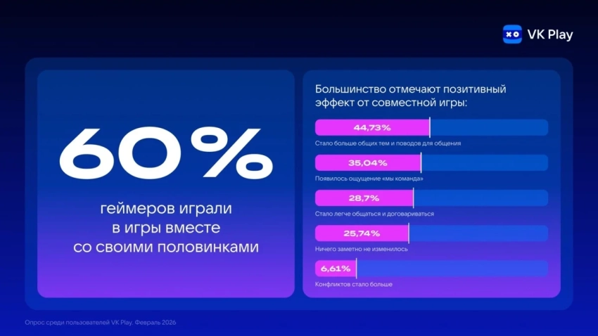 Совместный гейминг оказался распространённым явлением: 60% пар хотя бы раз играли вместе. При этом 32% женщин считают совместное прохождение игр хорошей идеей для свидания, тогда как среди мужчин так думают 20% участников опроса. Среди положительных эффектов совместной игры 44% респондентов назвали появление общих тем для общения, а 35% — чувство командной работы. Конфликты из-за игр возникают лишь у 6% пар.