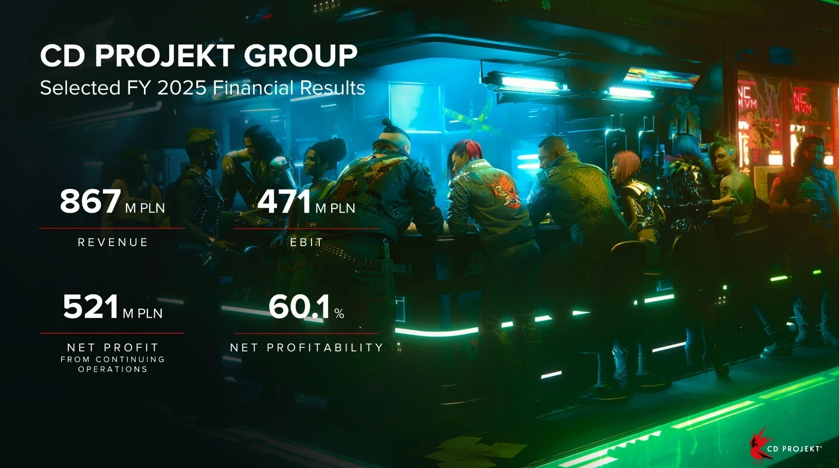 Обложка: скриншот Cyberpunk 2077CD Projekt поделилась финансовым отчётом за 2025 финансовый год. Компания заработала 867 миллионов злотых (около 233,5 млн долларов), а чистая прибыль составила 521 миллион злотых (около 140,3 млн долларов). По показателям прибыльности 2025 год стал вторым лучшим в истории CD Projekt.